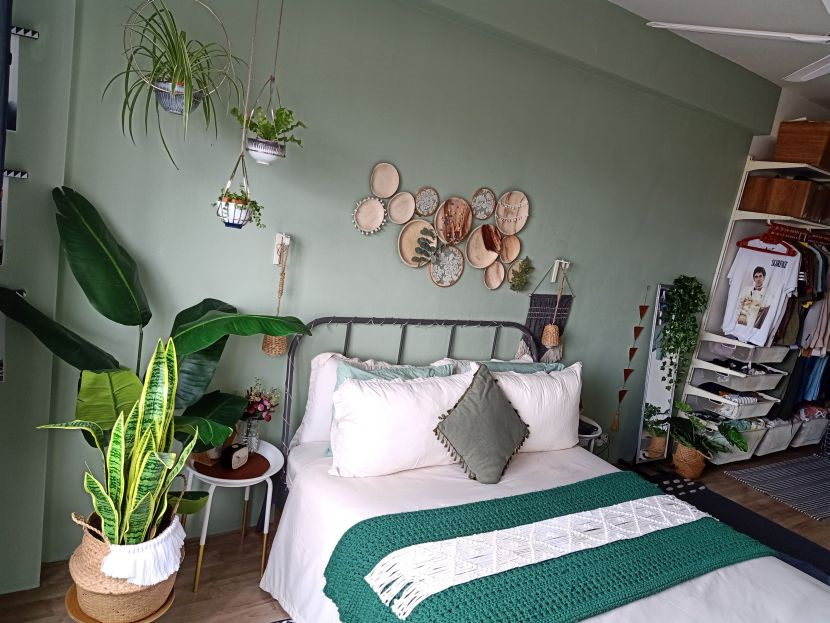 Penggunaan warna hijau pada dinding dipadankan dengan tumbuh-tumbuhan hijau sebagai aksesori selain menggunakan warna putih pada cadar bagi mengimbangi rona itu yang melatari kamar beradunya bersama suami.